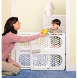 The Safety 1st plastic, pressure mounted high gate is easy to assemble. It has a one handed lock and release handle that is convenient for parents to unlock and relock. It expands wide so as to accommodate different size door openings.Model : 41817